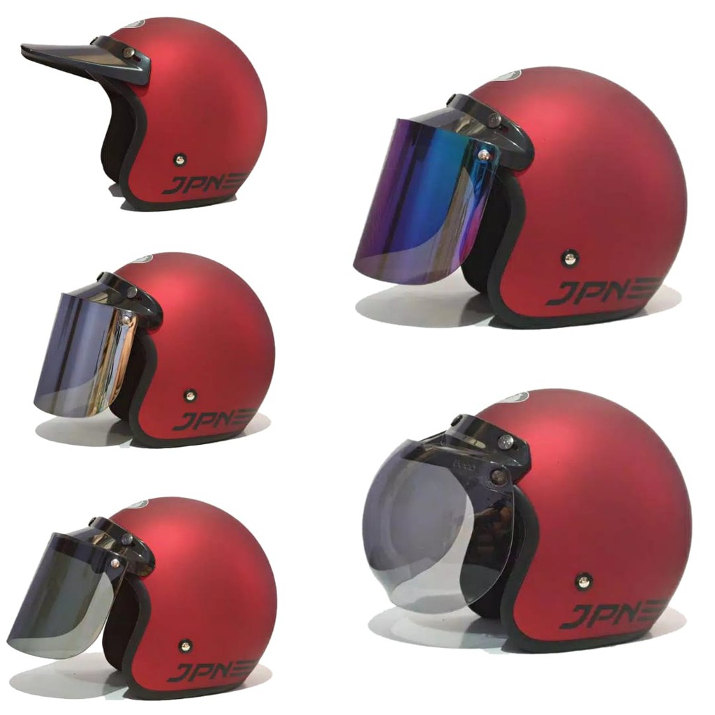 Kaca helm retro bogo datar merk injak tokopedia.link/xnyix3ds5q harga unit helm bisa berubah ubah, yang saya maksud 200rban hanya bundling helm dan visor helm bogo classic ksh red maroon , helm ini mempunyai kaca bogo original serta cangkang.